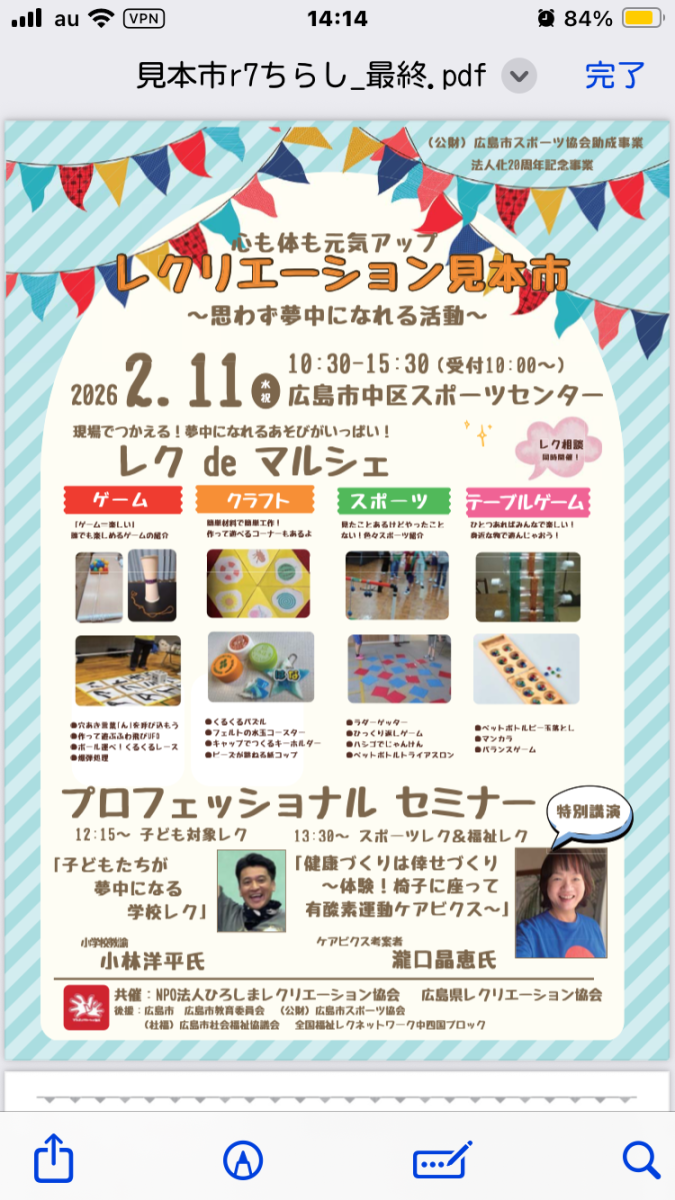 日別アーカイブ: 2026年1月23日 2月11日ひろしまレクリエーション協会 2月11日ひろしまレクリエーション協会主催「レクリエーション見本市」にお招きいただき、13:30〜15:30ケ …>続きを読む